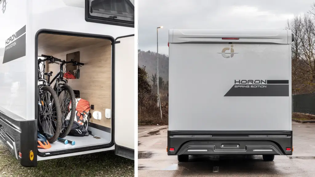 En el exterior, la Horon 88 XT Spring Edition presenta paredes en color gris y un garaje de gran capacidad, con amplia boca de carga y altura suficiente para transportar bicicletas u otros equipos voluminosos. Además, esta edición incluye panel solar de 200 W con regulador MPPT, toldo exterior en color antracita, toma exterior de gas y ducha en el garaje.