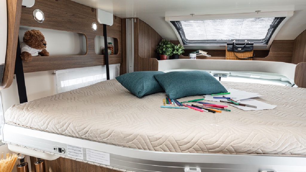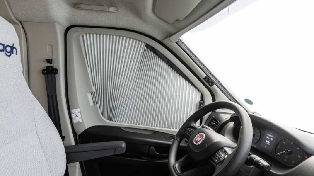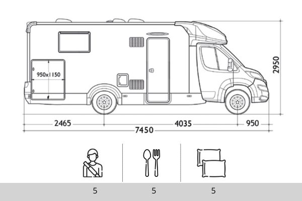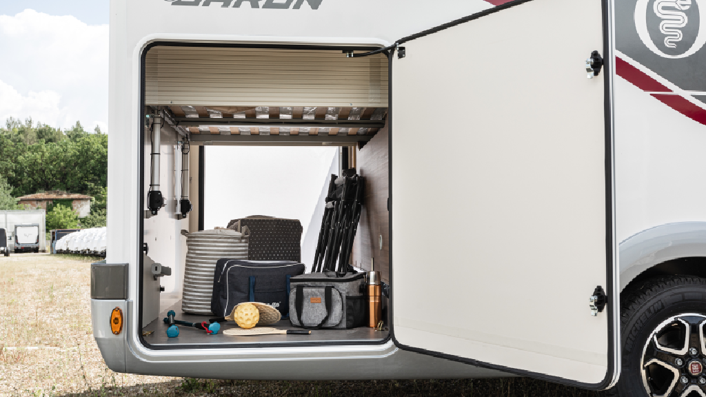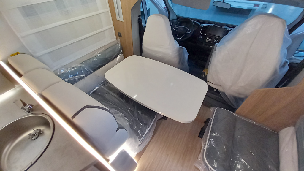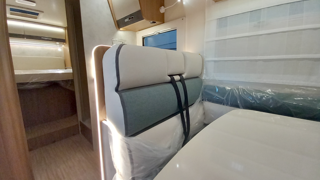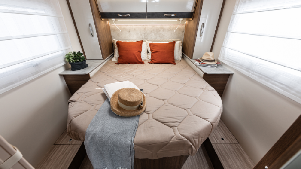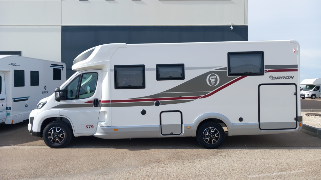 Con una longitud de 7,45 metros y 5 plazas homologadas para viajar y dormir, la Baron 579 destaca por su espaciosa cama isla trasera regulable en altura, una cama basculante eléctrica y la posibilidad de transformar la dinette en una quinta plaza para dormir. Su interior, con tapicería Macaron y una distribución luminosa gracias al skyroof panorámico, ofrece un ambiente acogedor y moderno.