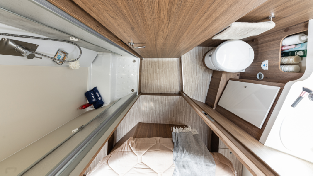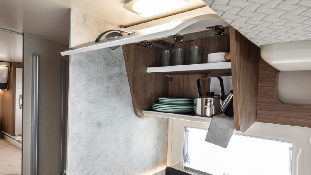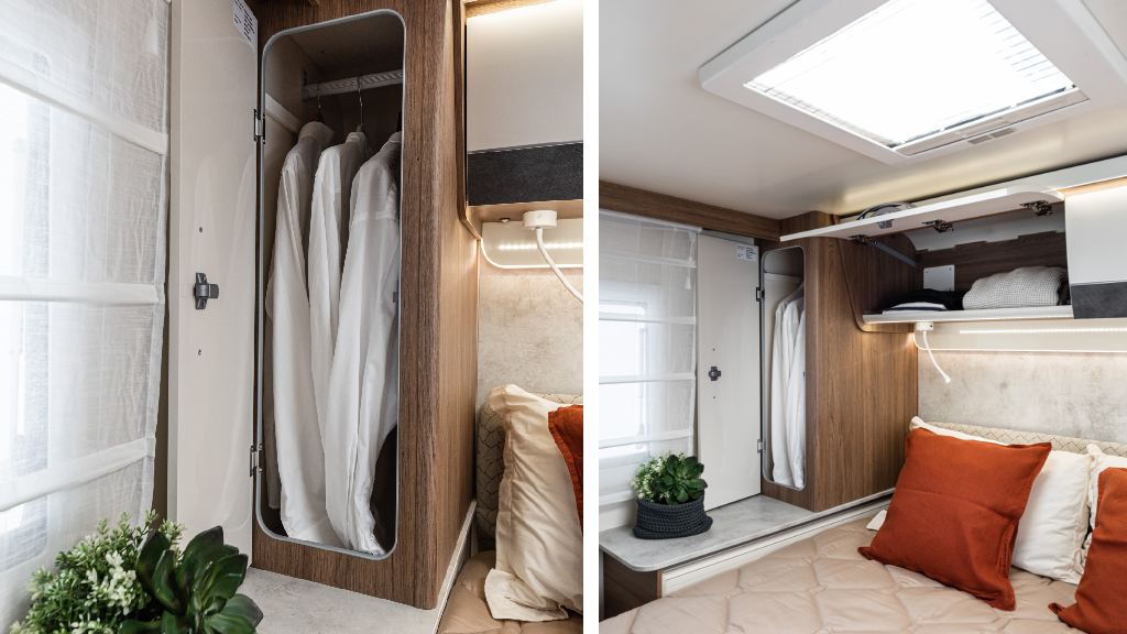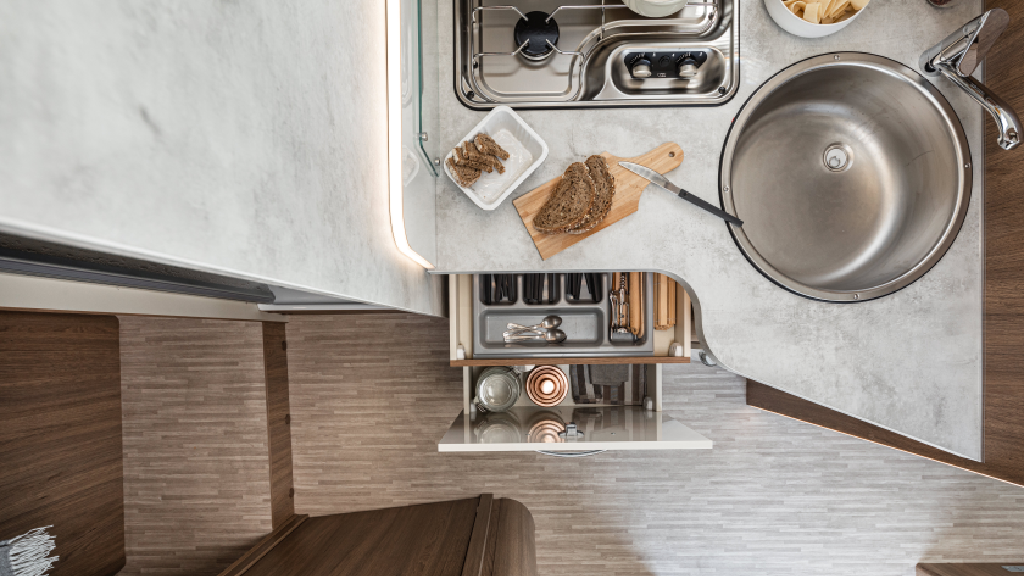 La cocina está equipada con frigorífico trivalente automático de 137 L, cocina de dos fuegos y múltiples compartimentos de almacenaje. En el baño, la ducha independiente con claraboya y percha integrada garantiza la máxima comodidad diaria. Además, la carrocería EXPS proporciona máxima impermeabilidad y aislamiento acústico, ideal para viajar durante todo el año con la calefacción Truma Combi 4 diésel.