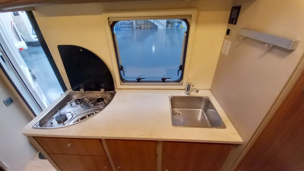 La cocina, ubicada en el centro del vehículo, permite cocinar de forma cómoda durante los viajes gracias a sus tres fuegos, amplios cajones y un frigorífico de 141 litros, ideal para estancias largas. Todo el interior cuenta con una buena altura libre, materiales resistentes y un ambiente luminoso que hace muy agradable la vida a bordo. La temperatura está controlada por el fiable sistema Combi C4 que proporciona calefacción y agua caliente a gas, garantizando confort en cualquier temporada.