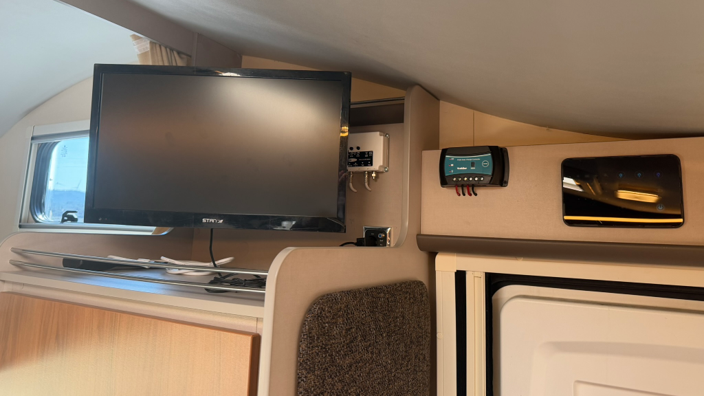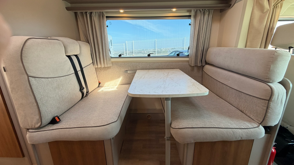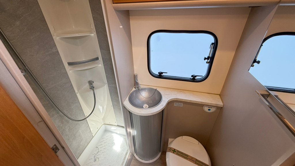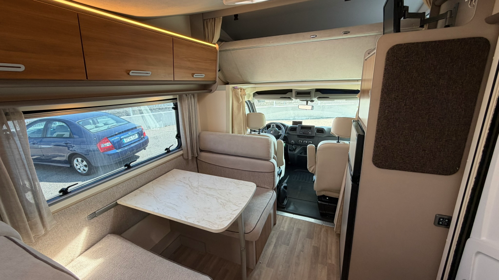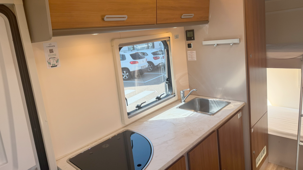 La cocina, ubicada en el centro del vehículo, permite cocinar de forma cómoda durante los viajes gracias a sus tres fuegos, amplios cajones y un frigorífico de 141 litros, ideal para estancias largas. Todo el interior cuenta con una buena altura libre, materiales resistentes y un ambiente luminoso que hace muy agradable la vida a bordo. La temperatura está controlada por el fiable sistema Combi C4 que proporciona calefacción y agua caliente a gas, garantizando confort en cualquier temporada.