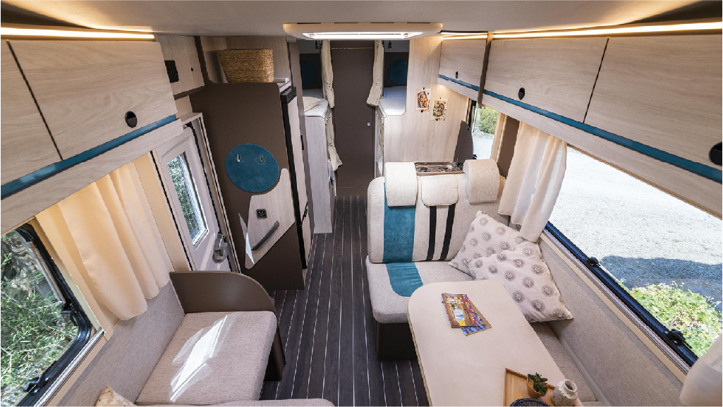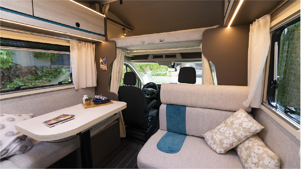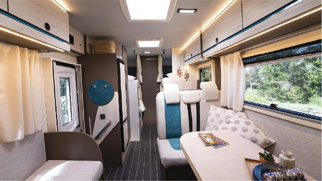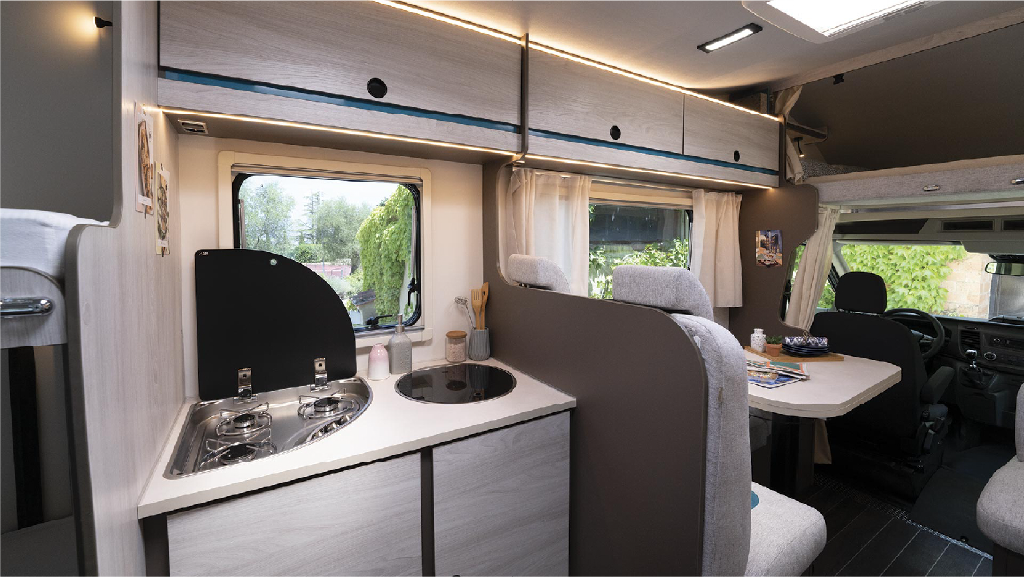 La vida a bordo se enriquece con un equipamiento completo: calefacción y calentador de agua Combi C4, cocina de tres hornillos y un frigorífico slim de 141 litros. Los asientos giratorios en la cabina permiten integrar el espacio de conducción con la zona de estar, mientras que la calefacción a gas asegura el máximo confort, incluso en climas fríos.