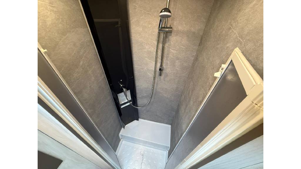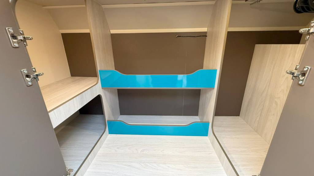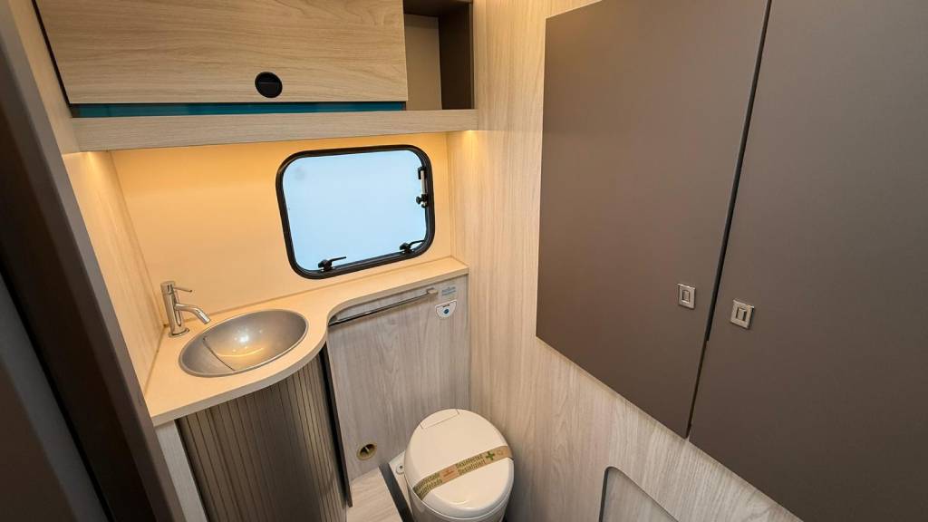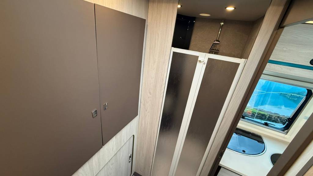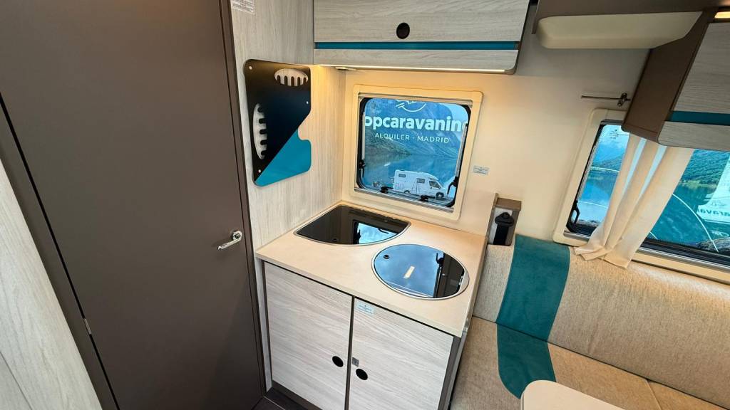 La zona de día ofrece un salón funcional con asientos de cabina giratorios y una cocina equipada con tres fuegos y frigorífico de 141 litros. El sistema Truma Combi C4 se encarga tanto de la calefacción como del agua caliente, garantizando confort en cualquier época del año.