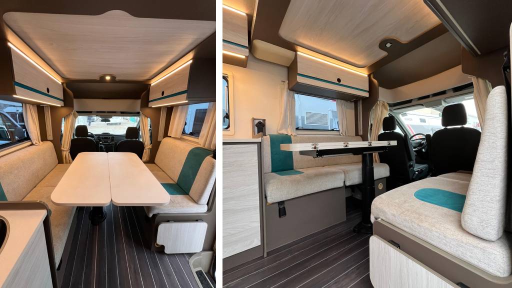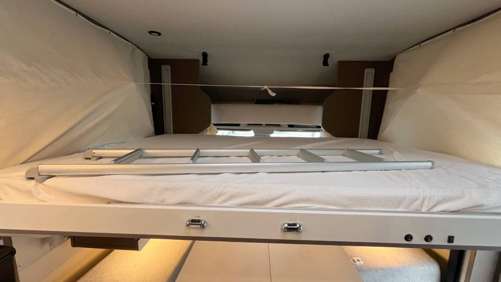 Dispone de 4 plazas homologadas para viajar y 4 plazas para dormir, gracias a su cama de matrimonio basculante sobre el salón (138 x 200 cm) y a la cama de matrimonio convertible en el comedor (140 x 220 cm), una solución muy práctica para aprovechar al máximo el espacio durante el día.