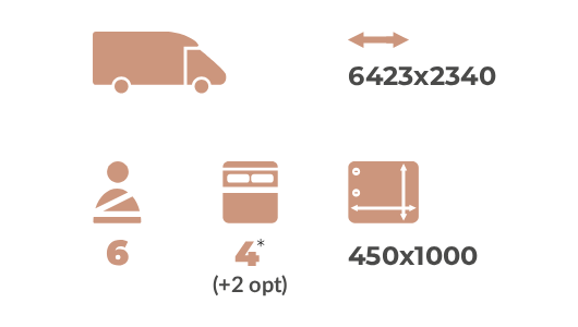 - Cama basculante delantera (1380 x 2000 mm), funcional y práctica.