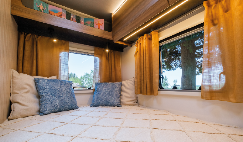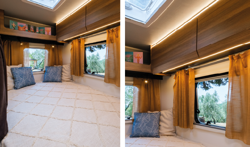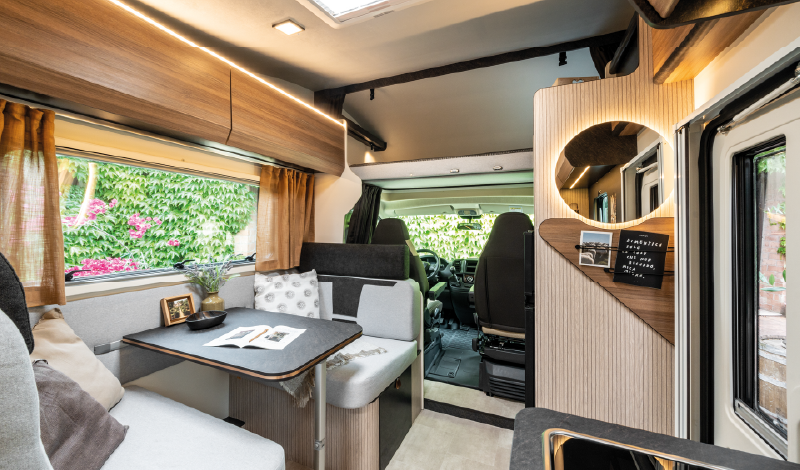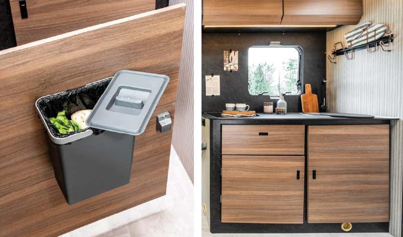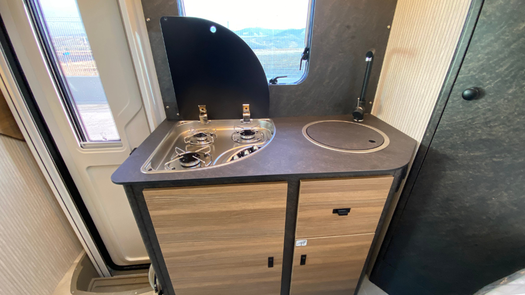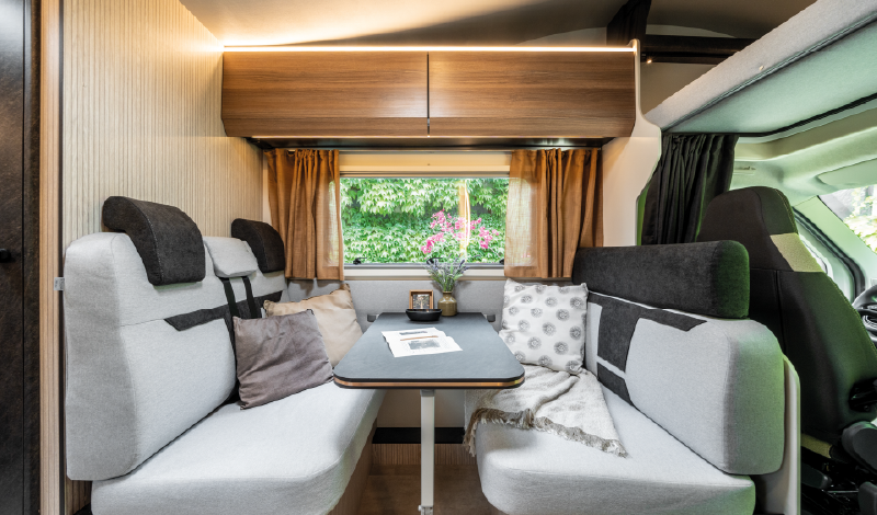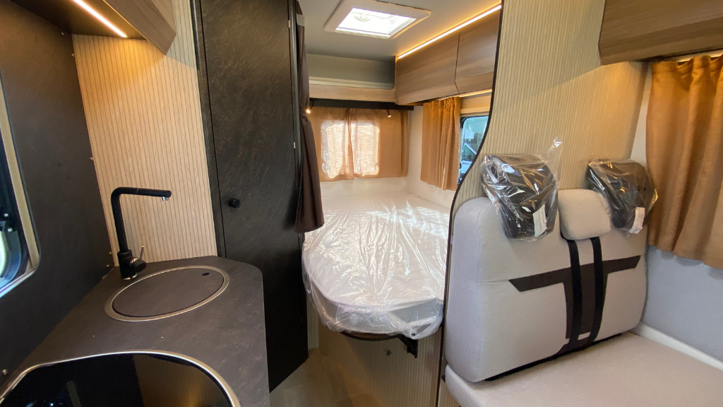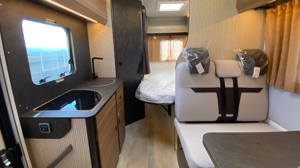 La zona de día ofrece un ambiente luminoso, funcional y acogedor. El mobiliario incluye cajones con freno, compartimentos XL y detalles de diseño como encimeras resistentes, grifería extraíble y tapa multifunción. Los asientos giratorios de cabina integran la zona del conductor en el comedor.