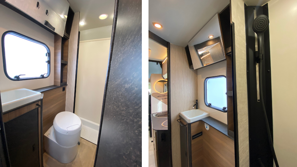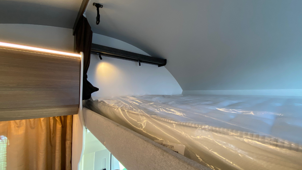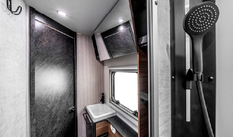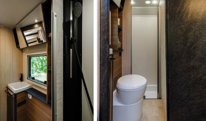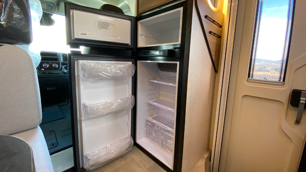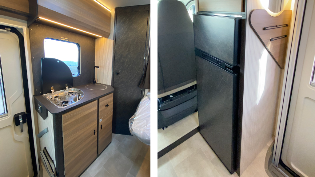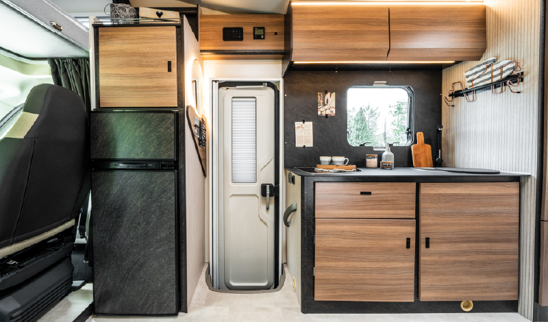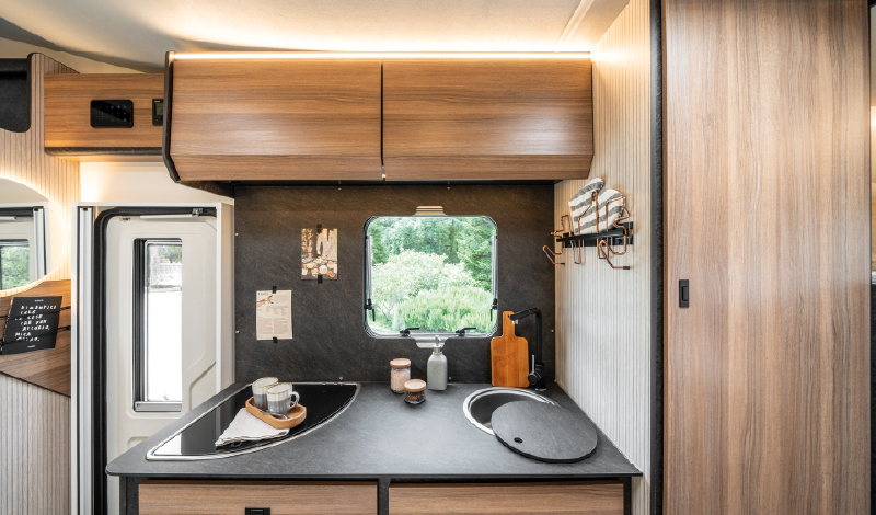 La zona de día ofrece un ambiente luminoso, funcional y acogedor. El mobiliario incluye cajones con freno, compartimentos XL y detalles de diseño como encimeras resistentes, grifería extraíble y tapa multifunción. Los asientos giratorios de cabina integran la zona del conductor en el comedor.