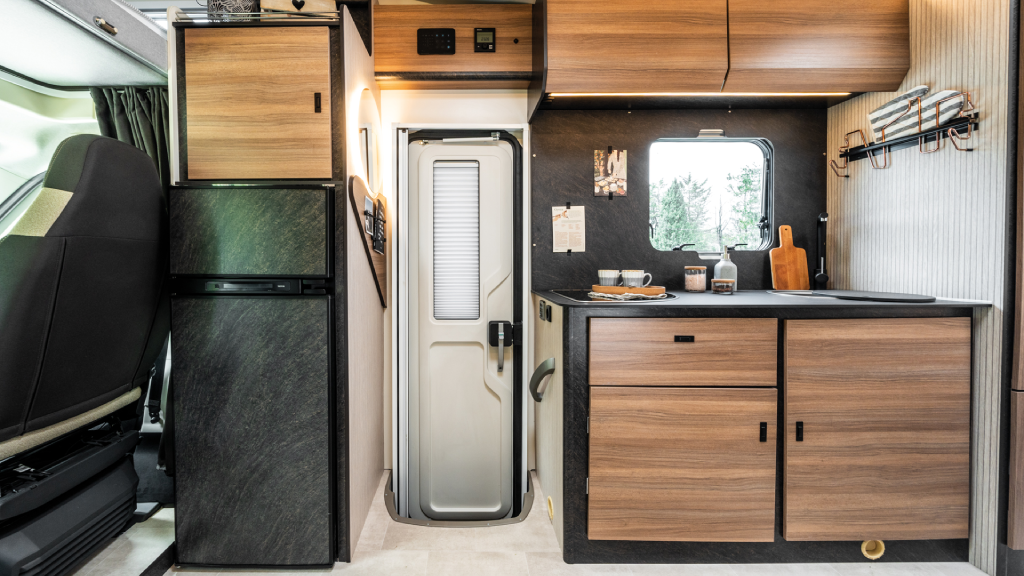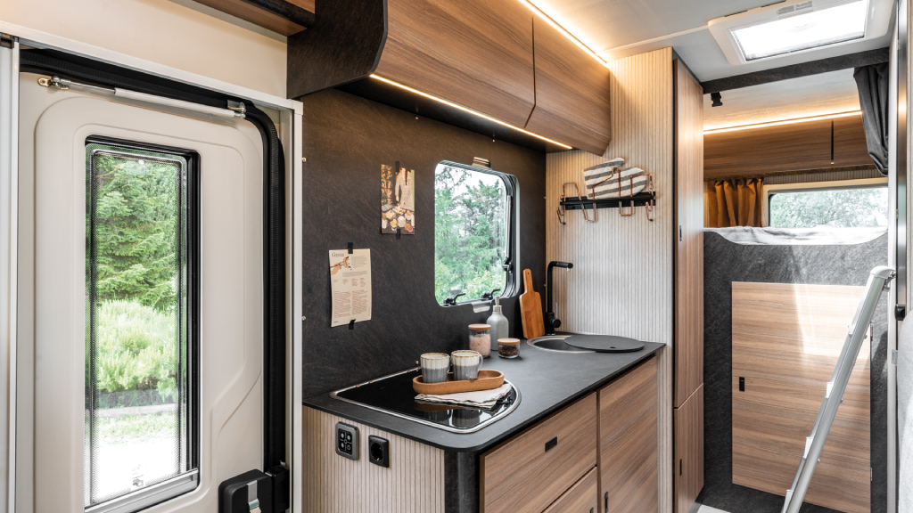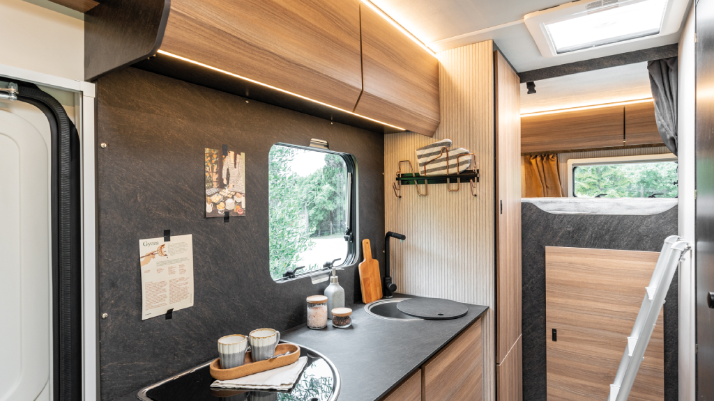 La Sarus 5 está equipada con un frigorífico grande de 145L, cocina con tres hornillos y calefacción a gas Combi C4, garantizando autonomía y confort en cualquier época del año.