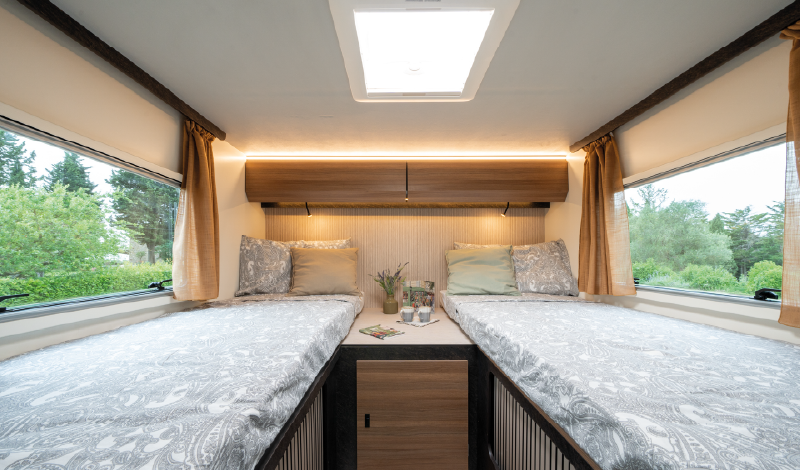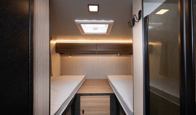 – Dos camas gemelas traseras convertibles en una cama king-size (1500 x 2200 mm)