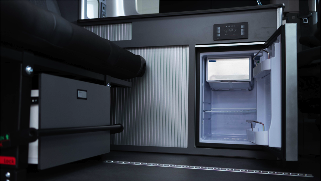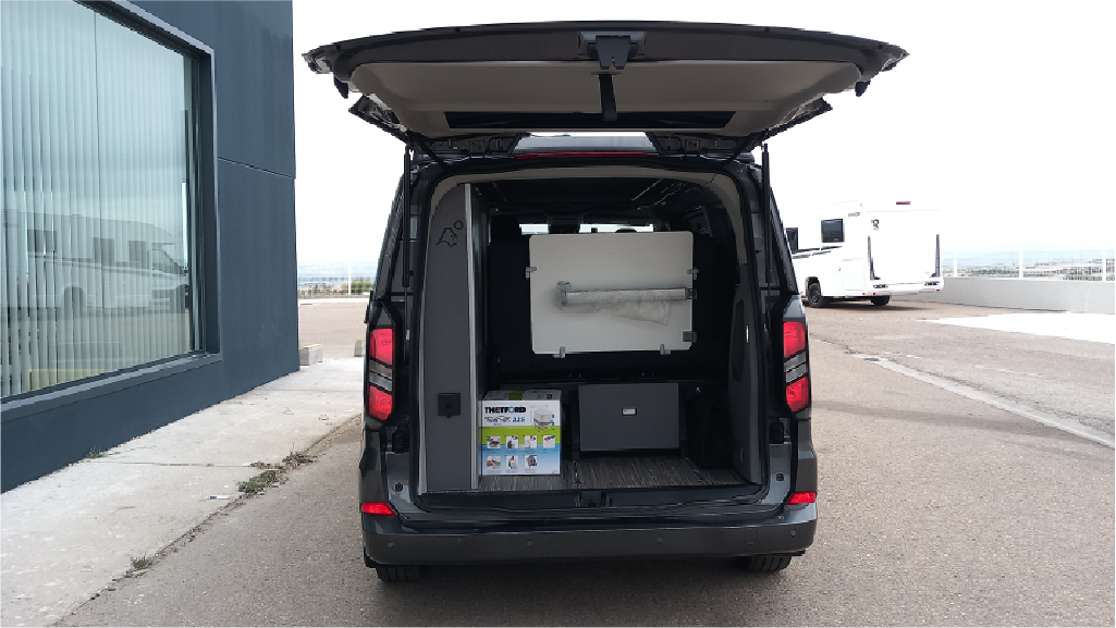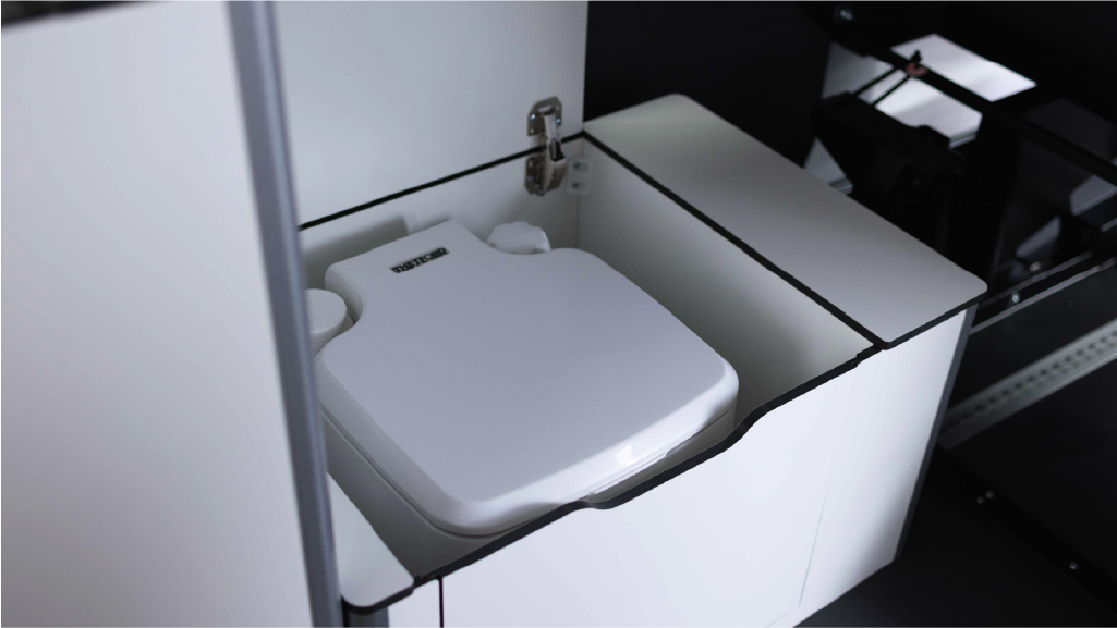 Este modelo, además, tiene calefacción que va con el combustible del vehículo, transformador de 12V a 230V, WC portátil, peldaño eléctrico y depósito de aguas grises calefactado.