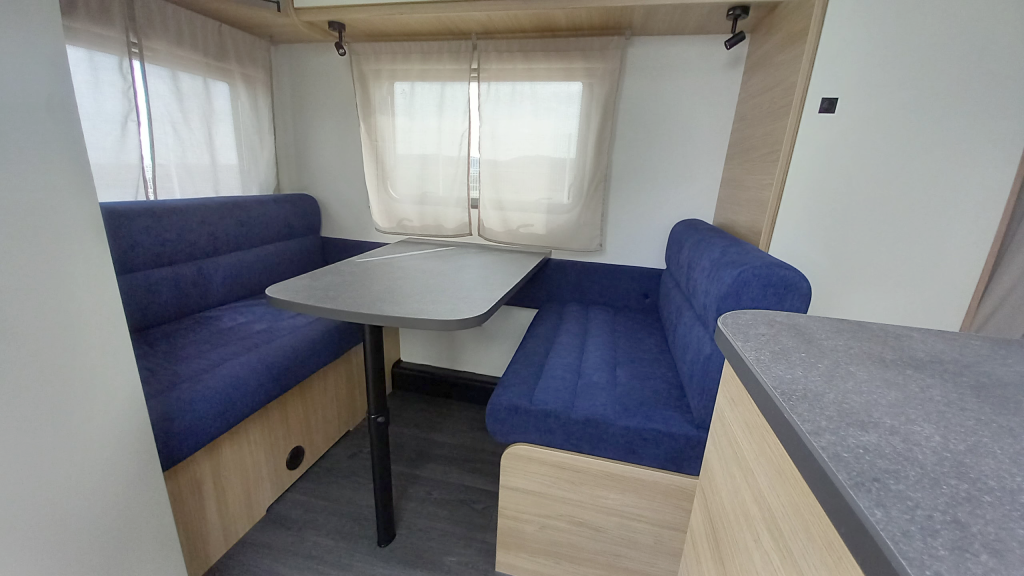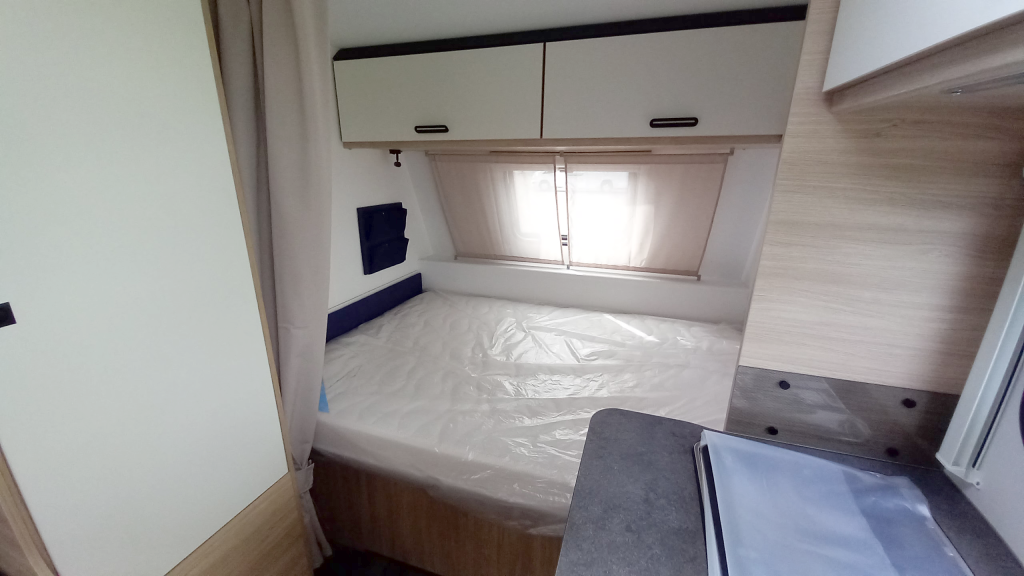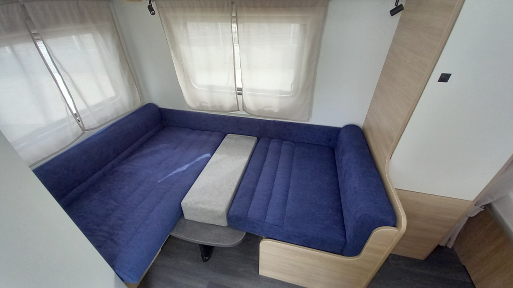 Con solo 5,95 m de largo total y una masa máxima autorizada de 950 kg, esta caravana es ideal para quienes buscan un modelo ágil y compatible con vehículos de tracción media. A pesar de su tamaño compacto, ofrece 3 plazas para dormir, con una cama de matrimonio delantera (138×190 cm) y una cama convertible trasera (125/86×190 cm).