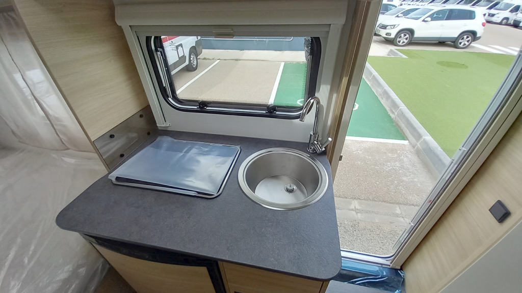 La zona de cocina integra un frigorífico con compresor de 85 litros, cocina de 2 fuegos y fregadero en inox. Además, cuenta con depósito de aguas limpias de 12L. En el cuarto de aseo, encontrarás WC cassette eléctrico y plato de ducha para mayor autonomía.