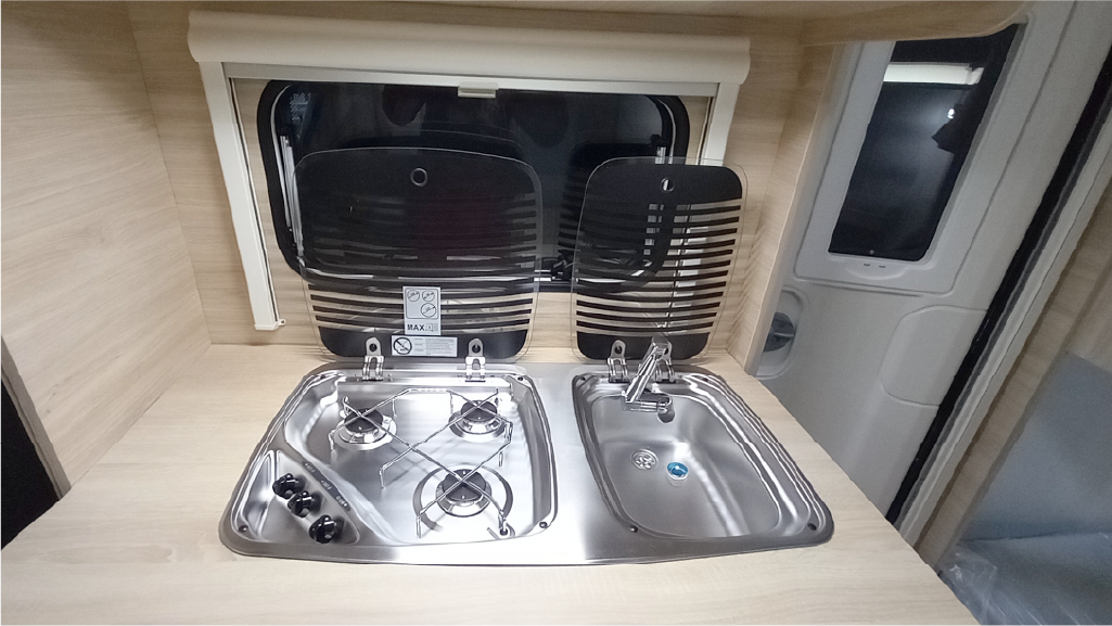 - Frigorífico XL FREEZE de 150L, cocina-fregadero de 3 fuegos con tapa de vidrio y fregadero de acero inoxidable.