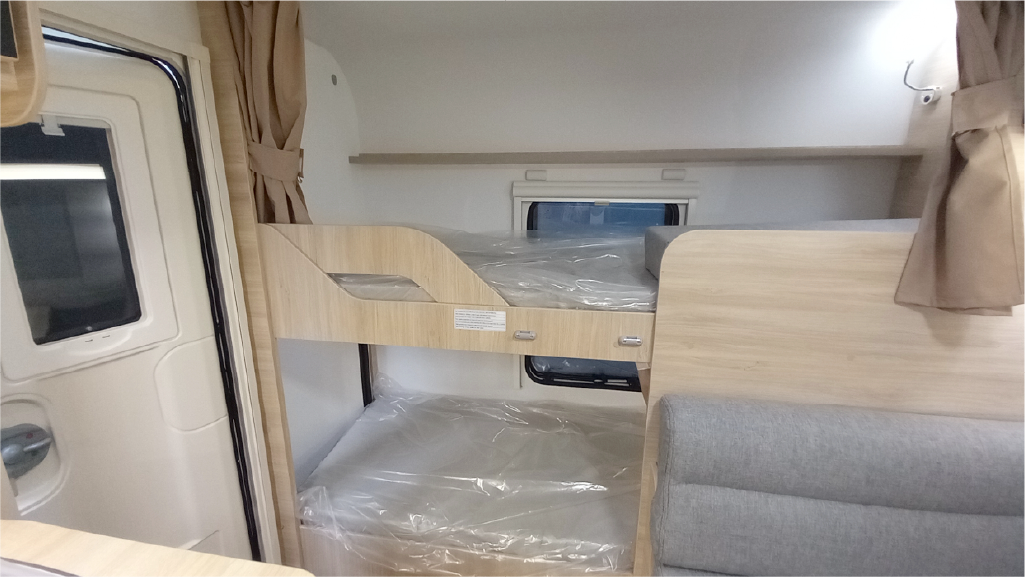 - Hasta 5 plazas con cama de matrimonio (138×198 cm), cama central (96×185 cm) y literas de 73×212 cm.